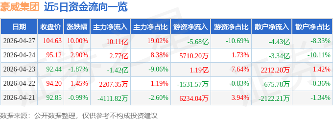 4月27日的资金流向数据方面,主力资金净流入10.11亿元,占总成交额19.02%,游资资金净流出5.68亿元,占总成交额10.69%,散户资金净流出4.43亿元,占总成交额8.33%。